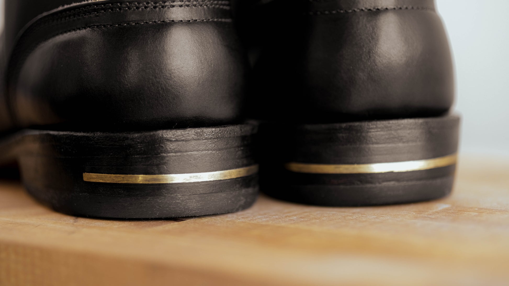 Brass accents throughout the boot from the eyelets and bottoming nails culminate all to a signature solid brass plate sawed, inserted and sanded to shape into the leather heel stack, creating a distinctive feature that commands attention from every corner of the room.